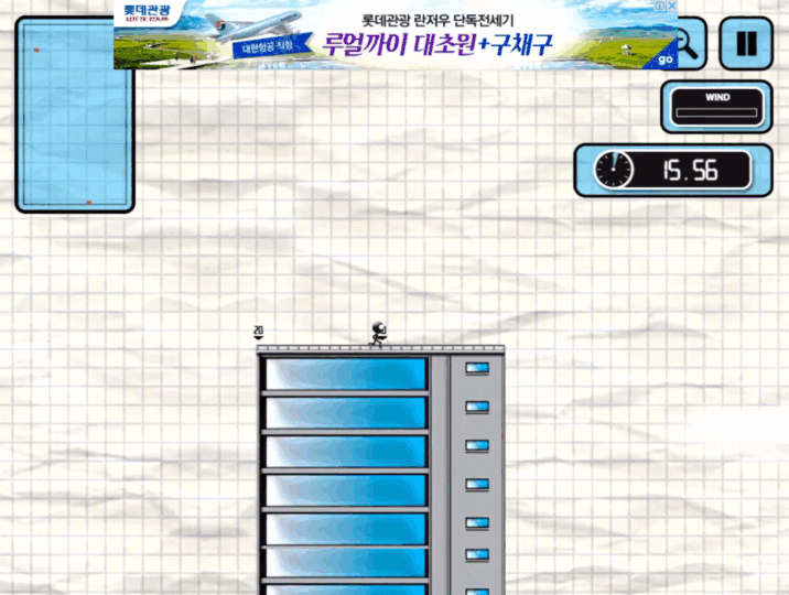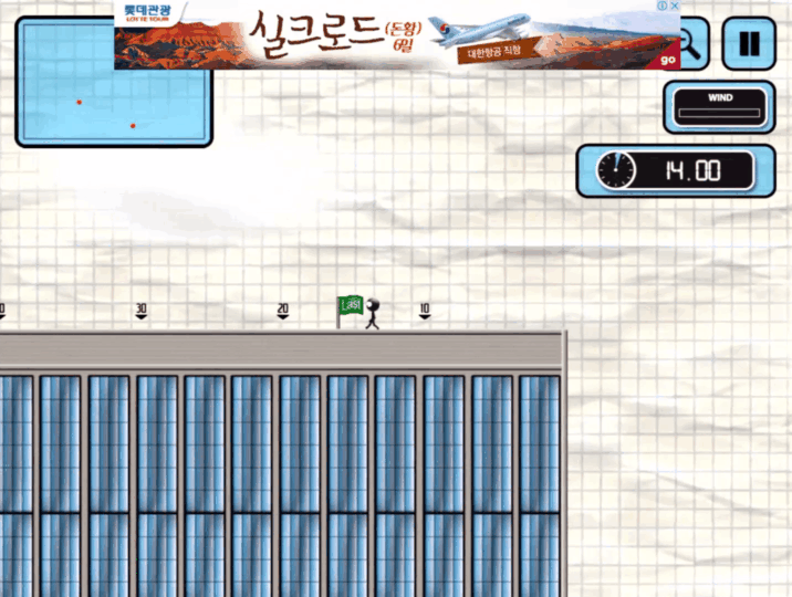스틱맨은 건물에서 다이빙해서 빠르게 낙하하다가 중간에 낙하산을 펼치고 안전하게 내려와야 합니다. 정해진 시간 안에 깃대가 꽂힌 구간에 안착하면 성공입니다.