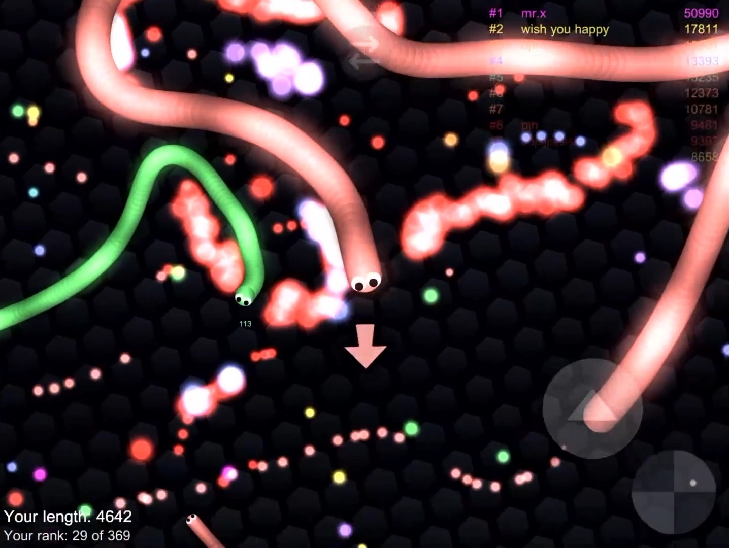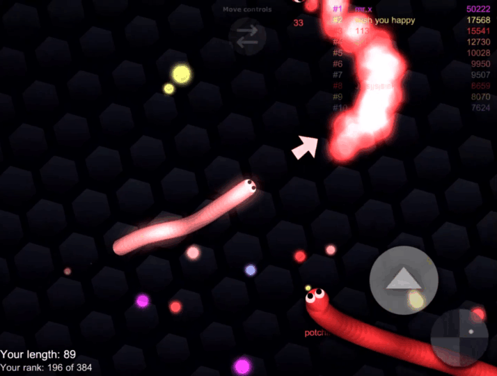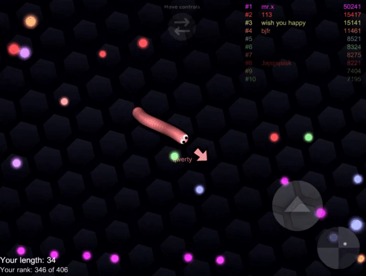경쟁자들을 조심해야 합니다. 지렁이의 머리가 상대와 충돌하는 순간 게임이 끝납니다. 그리고 내가 사라진 자리에 남긴 알맹이는 상대를 쑥쑥 자라게 하는 양분이 됩니다.