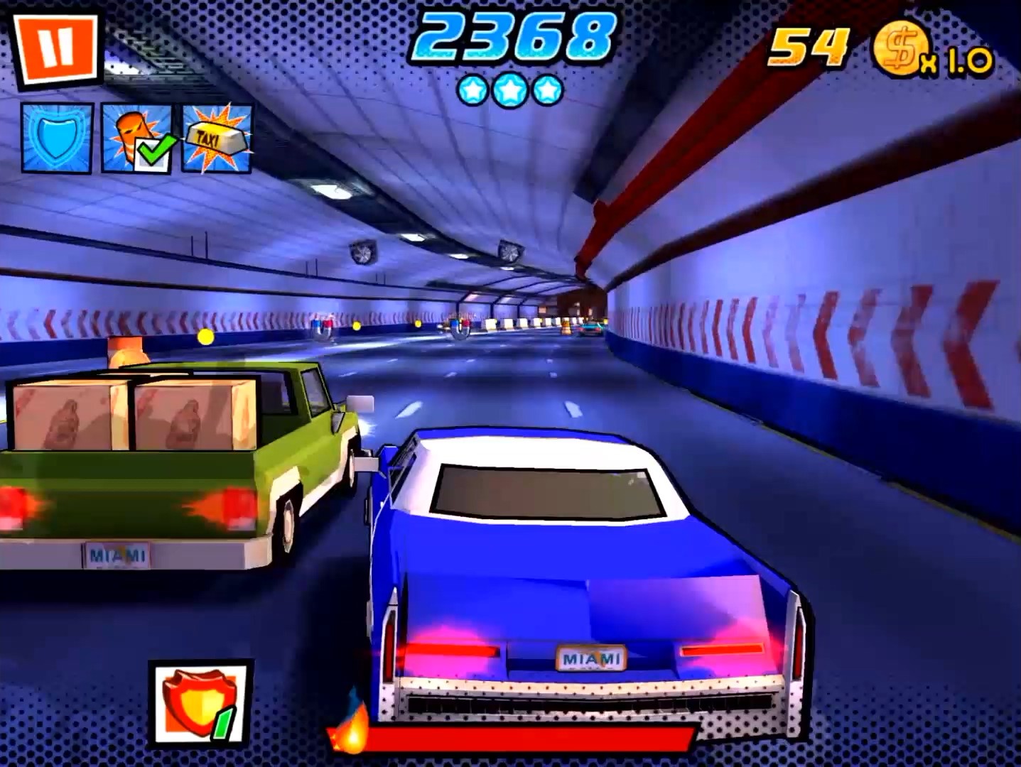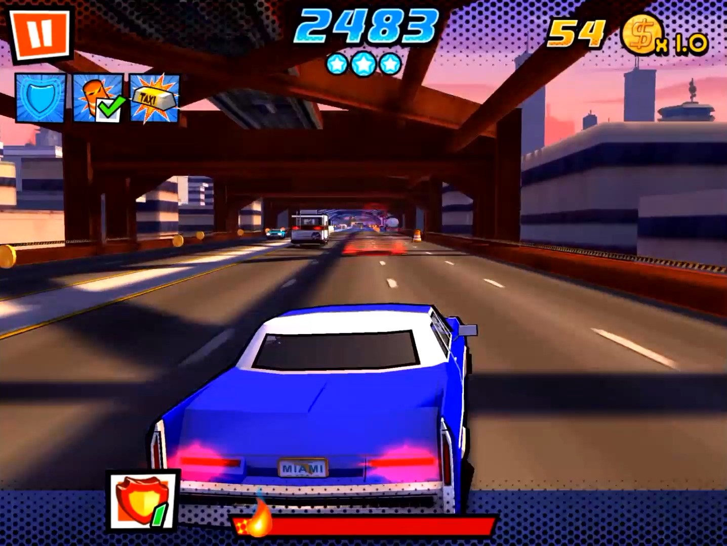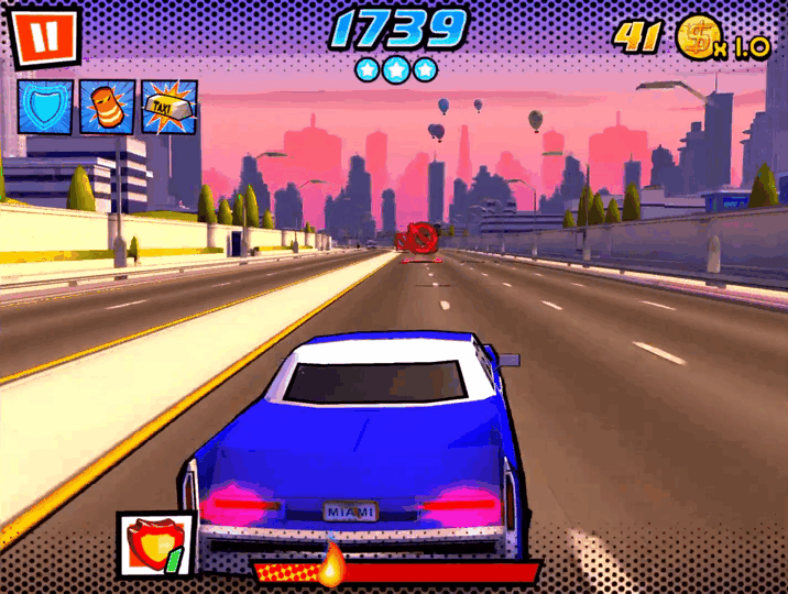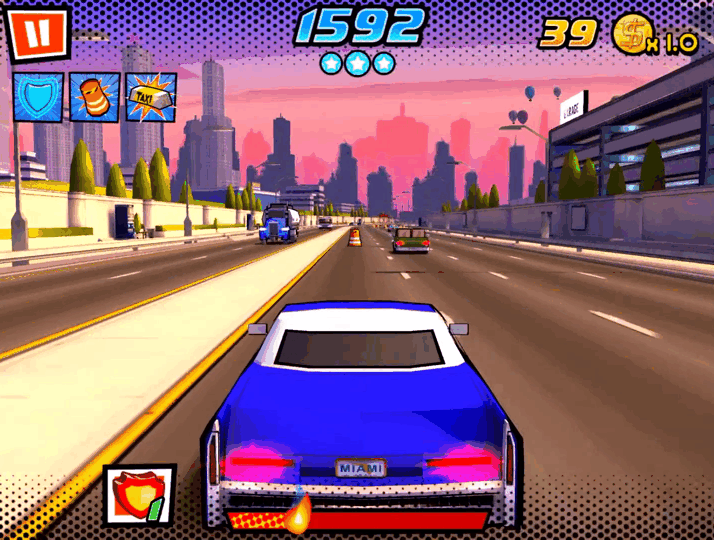 3D 그래픽으로 표현한 카툰 느낌의 매력적인 마이애미를 배경으로 도로에서 난폭 운전하는 자동차 달리기 게임입니다. 주인공을 추격하는 경찰차를 따돌리고 도로 위의 장애물을 회피하며 질주하여 이동거리 최고기록을 세워야합니다.